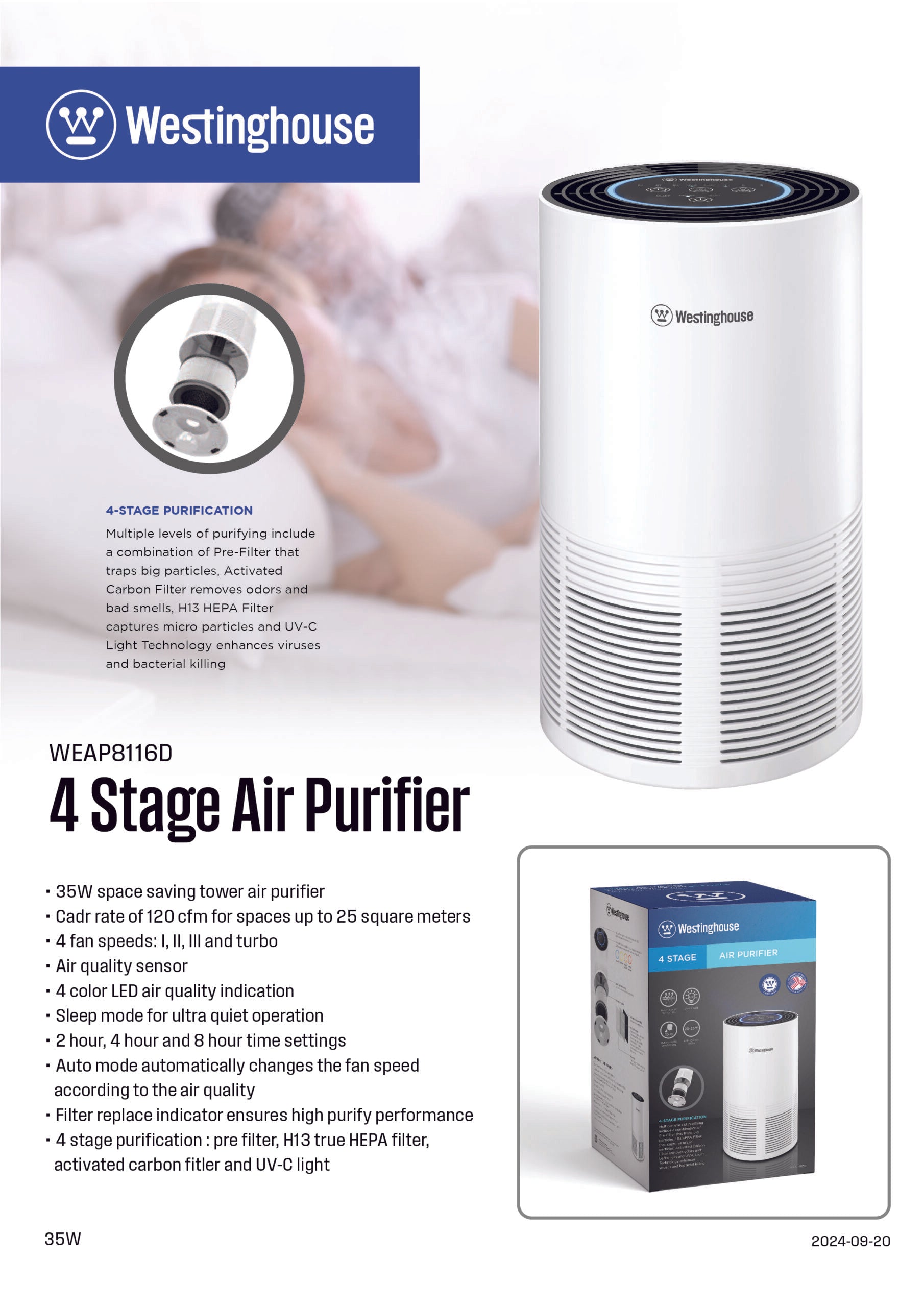 Experience fresh and pure air with the Westinghouse WEAP8116D, a sleek and efficient air purifier perfect for modern living spaces. Its advanced 4-stage purification system ensures optimal air quality while maintaining a compact and stylish design.